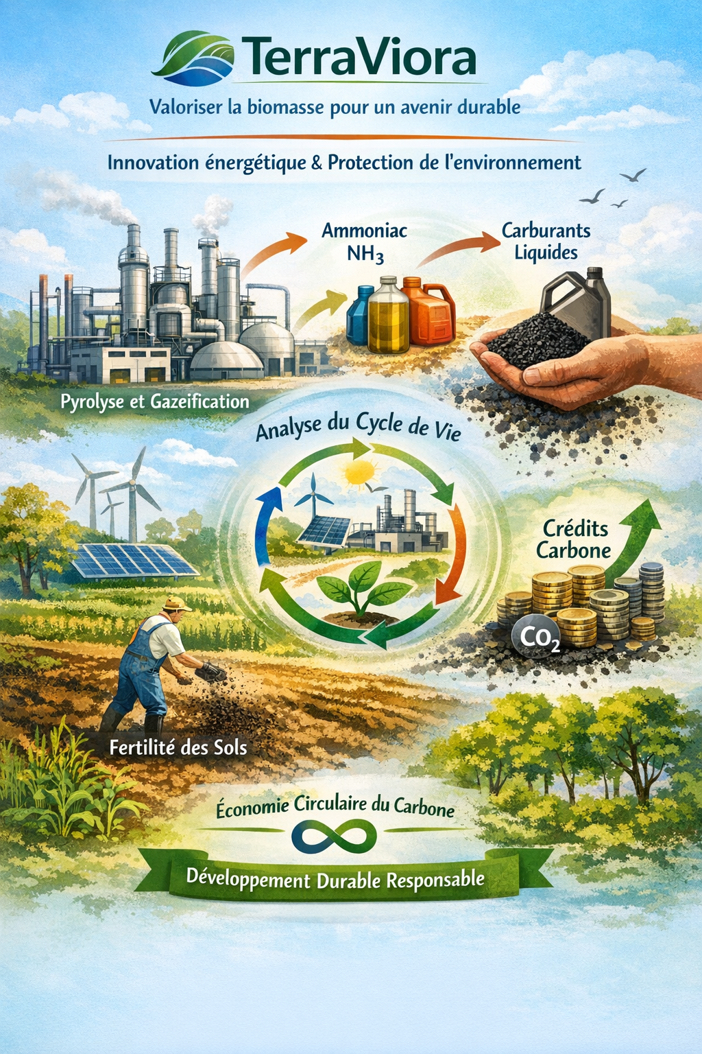 TerraViora valorise la biomasse pour produire énergie renouvelable, gaz de synthèse, ammoniac, carburants liquides et biochar, contribuant à la régénération des sols et à la séquestration du carbone dans une démarche d’économie circulaire durable.